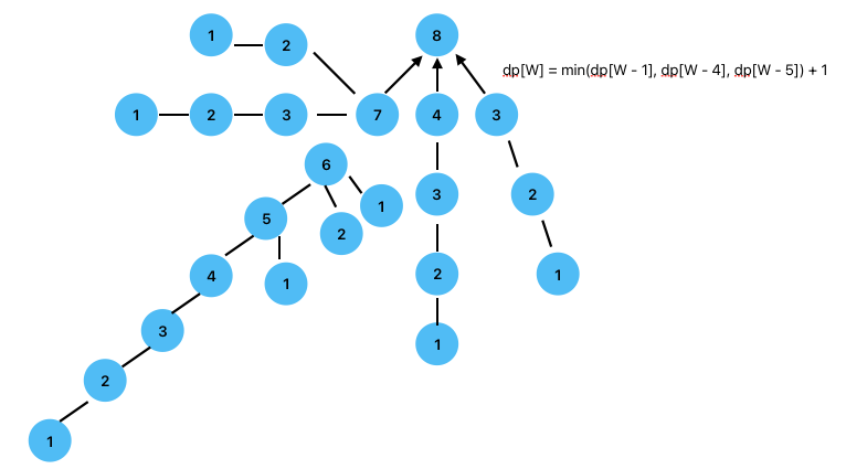 $$ dp[W] = min(dp[W - 1], dp[W - 4], dp[W - 5]) + 1 $$