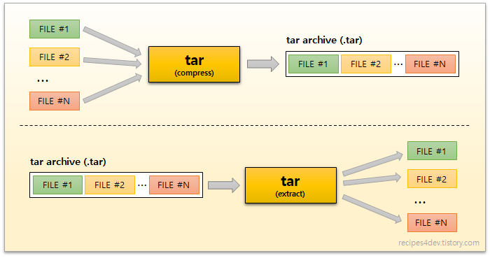 즉, tar는 여러 파일을 하나로 묶을 때 사용하는 것입니다. (용량변화 없이 하나로 모으는 것)