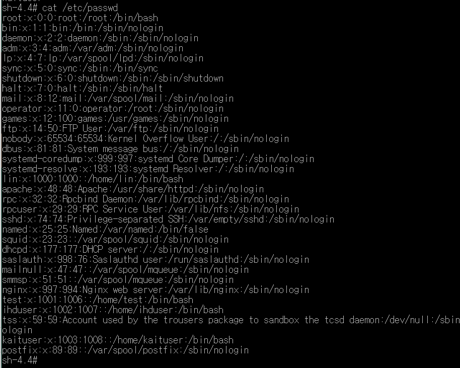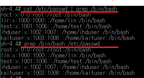 cat과 grep을 이용한 방법이다.(사용자를 생성하면 기본값으로 /bin/bash가 정해지기에 해당 키워드로 잡았다.)
