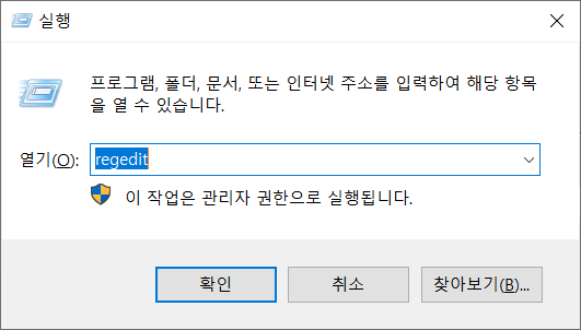 1. win+r을 실행하여 regedit을 입력하여 레지스트리 편집창을 엽니다.